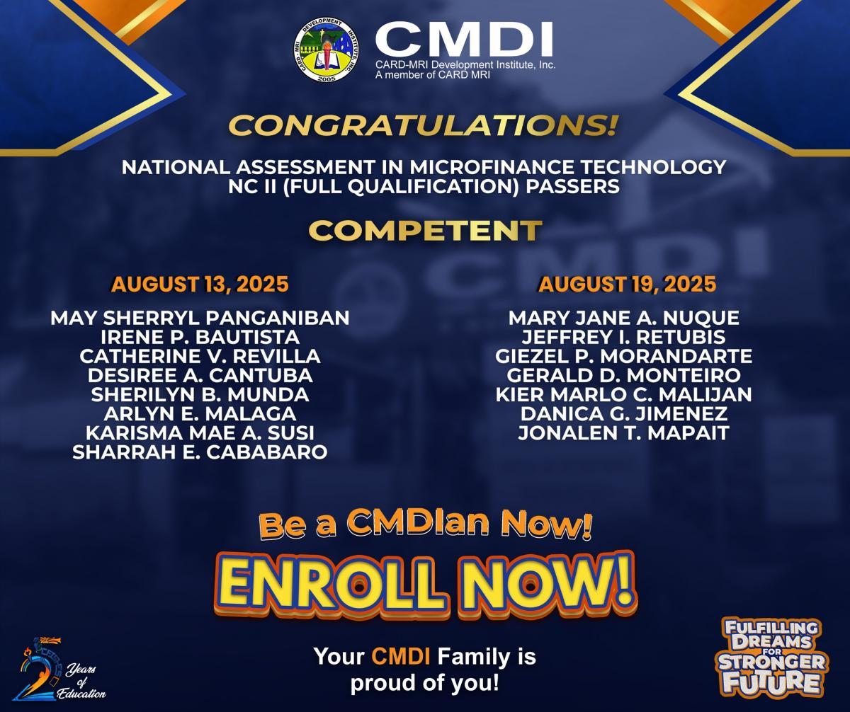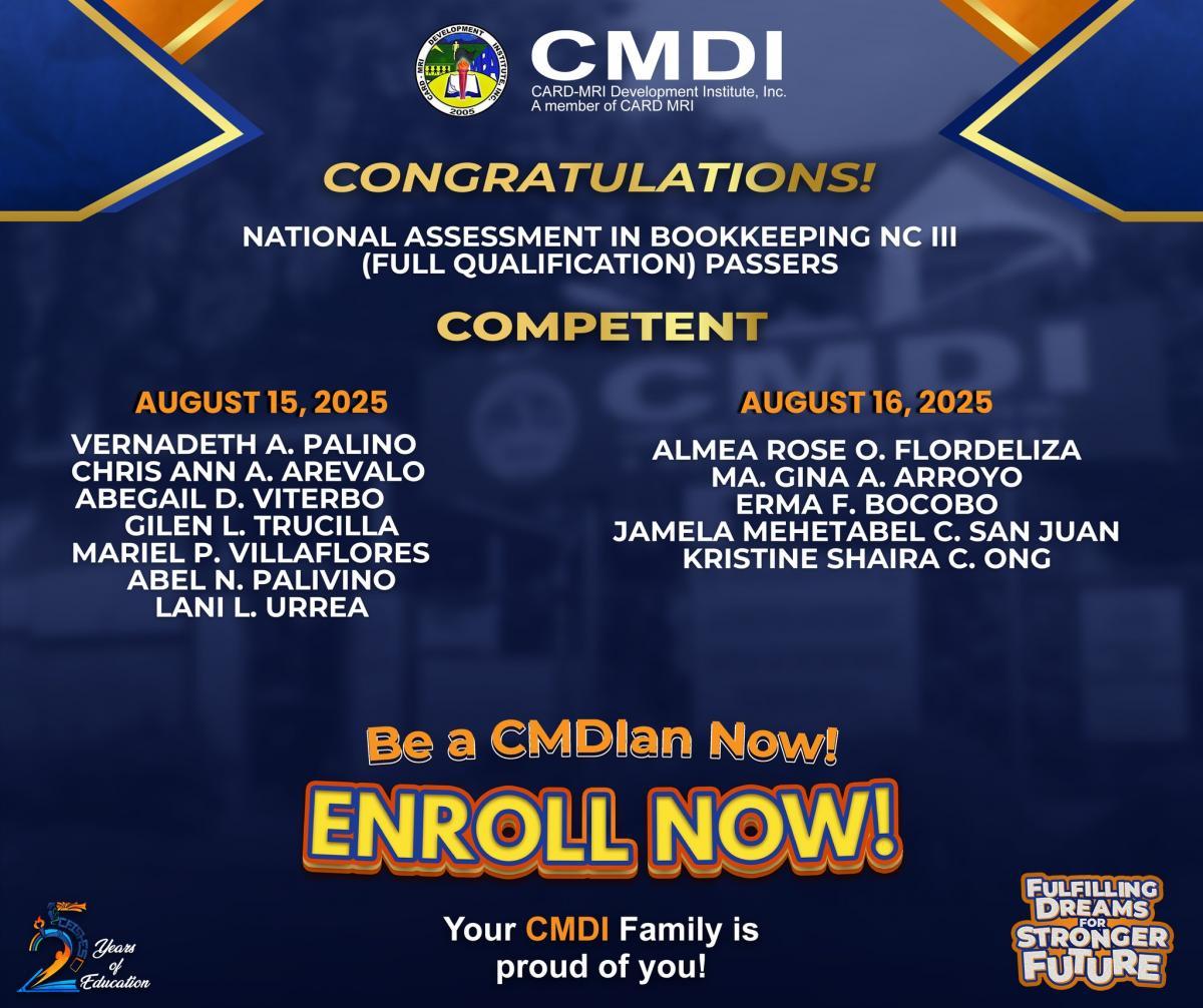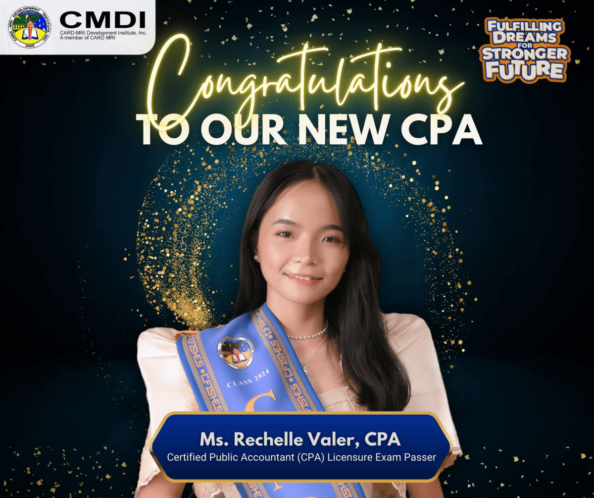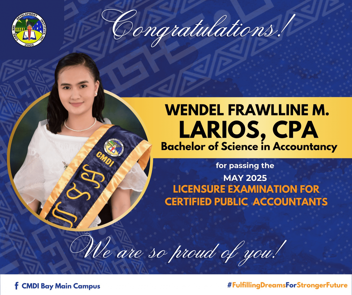 CMDI extends its heartfelt congratulations to Wendel Frawlline M. Larios for passing the Certified Public Accountant Licensure Examination (CPALE) last May 2025.