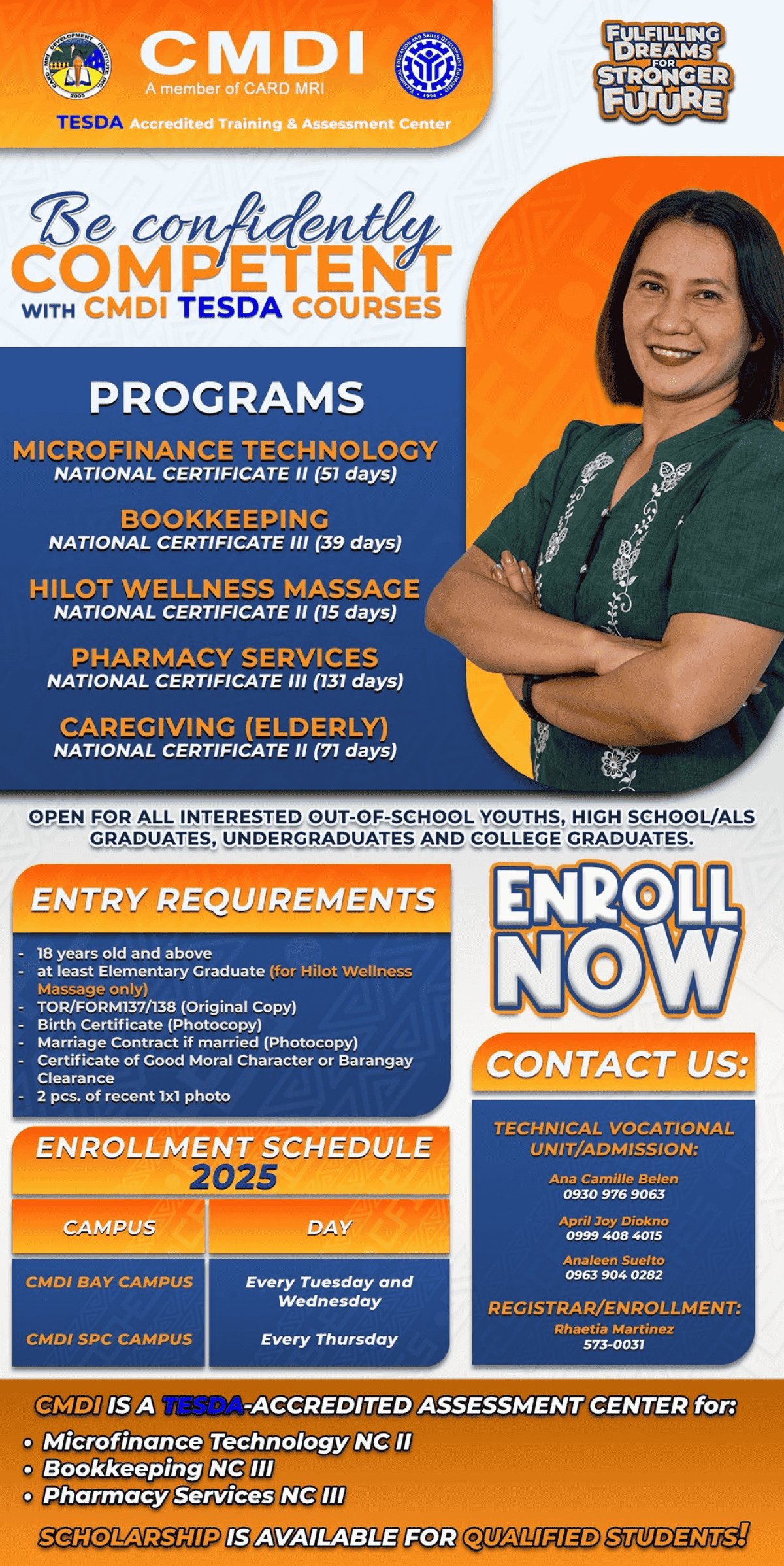 ENROLL NOW at the CMDI Technical Vocational Unit to acquire certification in the following programs: