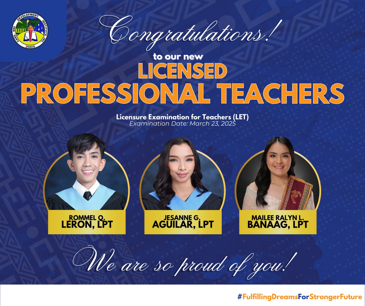 Let us congratulate Mr. Rommel Q. Leron, LPT, Ms. Jesanne G. Aguilar, LPT, Ms. Mailee Ralyn L. Banaag, LPT for passing the March 2025 Licensure Examination for Professional Teachers. Your commitment to bring the quality education every CMDIans need will undoubtedly support our mission on poverty eradication. Kudos!